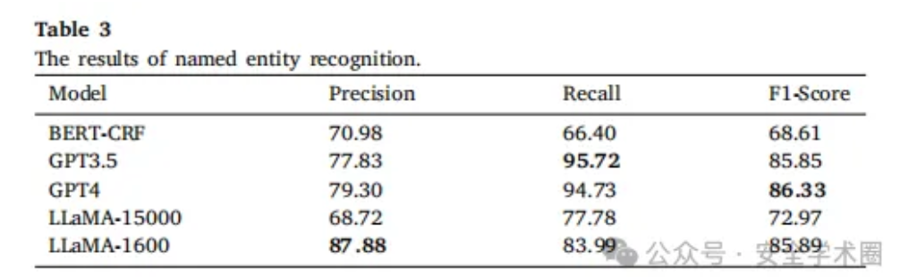 下表展示了不同模型在威胁情报知识图谱构建中的命名实体识别(NER)性能对比: