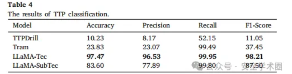 本研究基于MITRE ATT&CK框架,评估了规则匹配方法(TTPDrill)、传统机器学习方法(Tram) 和微调大模型(LLaMA) 在攻击技术分类任务上的表现。其中,基于规则的 TTPDrill 方法因无法有效识别新型攻击的表述变体,表现最差(准确率仅10.23%,F1=11.05%),充分验证了纯规则方法的固有局限性。