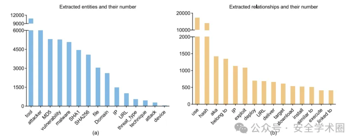 下表展示了LLM-TIKG构建的威胁情报知识图谱中实体与关系的分布情况: