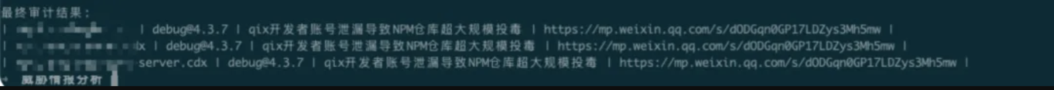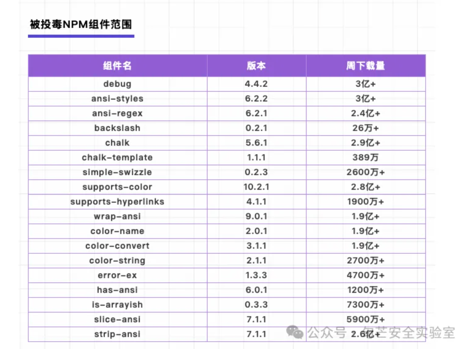 [ { "component": "debug", "version": "4.4.2", "description": "qix开发者账号泄漏导致NPM仓库超大规模投毒", "reference_link": "https://mp.weixin.qq.com/s/dODGqn0GP17LDZys3Mh5mw", "info_time": "2025-09-09" }, { "component": "ansi-styles", "version": "6.2.2", "description": "qix开发者账号泄漏导致NPM仓库超大规模投毒", "reference_link": "https://mp.weixin.qq.com/s/dODGqn0GP17LDZys3Mh5mw", "info_time": "2025-09-09" }, { "component": "ansi-regex", "version": "6.2.1", "description": "qix开发者账号泄漏导致NPM仓库超大规模投毒", "reference_link": "https://mp.weixin.qq.com/s/dODGqn0GP17LDZys3Mh5mw", "info_time": "2025-09-09" }, { "component": "backslash", "version": "0.2.1", "description": "qix开发者账号泄漏导致NPM仓库超大规模投毒", "reference_link": "https://mp.weixin.qq.com/s/dODGqn0GP17LDZys3Mh5mw", "info_time": "2025-09-09" }, { "component": "chalk", "version": "5.6.1", "description": "qix开发者账号泄漏导致NPM仓库超大规模投毒", "reference_link": "https://mp.weixin.qq.com/s/dODGqn0GP17LDZys3Mh5mw", "info_time": "2025-09-09" }, { "component": "chalk-template", "version": "1.1.1", "description": "qix开发者账号泄漏导致NPM仓库超大规模投毒", "reference_link": "https://mp.weixin.qq.com/s/dODGqn0GP17LDZys3Mh5mw", "info_time": "2025-09-09" }, { "component": "simple-swizzle", "version": "0.2.3", "description": "qix开发者账号泄漏导致NPM仓库超大规模投毒", "reference_link": "https://mp.weixin.qq.com/s/dODGqn0GP17LDZys3Mh5mw", "info_time": "2025-09-09" }, { "component": "supports-color", "version": "10.2.1", "description": "qix开发者账号泄漏导致NPM仓库超大规模投毒", "reference_link": "https://mp.weixin.qq.com/s/dODGqn0GP17LDZys3Mh5mw", "info_time": "2025-09-09" }, { "component": "supports-hyperlinks", "version": "4.1.1", "description": "qix开发者账号泄漏导致NPM仓库超大规模投毒", "reference_link": "https://mp.weixin.qq.com/s/dODGqn0GP17LDZys3Mh5mw", "info_time": "2025-09-09" }, { "component": "wrap-ansi", "version": "9.0.1", "description": "qix开发者账号泄漏导致NPM仓库超大规模投毒", "reference_link": "https://mp.weixin.qq.com/s/dODGqn0GP17LDZys3Mh5mw", "info_time": "2025-09-09" }, { "component": "color-name", "version": "2.0.1", "description": "qix开发者账号泄漏导致NPM仓库超大规模投毒", "reference_link": "https://mp.weixin.qq.com/s/dODGqn0GP17LDZys3Mh5mw", "info_time": "2025-09-09" }, { "component": "color-convert", "version": "3.1.1", "description": "qix开发者账号泄漏导致NPM仓库超大规模投毒", "reference_link": "https://mp.weixin.qq.com/s/dODGqn0GP17LDZys3Mh5mw", "info_time": "2025-09-09" }, { "component": "color-string", "version": "2.1.1", "description": "qix开发者账号泄漏导致NPM仓库超大规模投毒", "reference_link": "https://mp.weixin.qq.com/s/dODGqn0GP17LDZys3Mh5mw", "info_time": "2025-09-09" }, { "component": "error-ex", "version": "1.3.3", "description": "qix开发者账号泄漏导致NPM仓库超大规模投毒", "reference_link": "https://mp.weixin.qq.com/s/dODGqn0GP17LDZys3Mh5mw", "info_time": "2025-09-09" }, { "component": "has-ansi", "version": "6.0.1", "description": "qix开发者账号泄漏导致NPM仓库超大规模投毒", "reference_link": "https://mp.weixin.qq.com/s/dODGqn0GP17LDZys3Mh5mw", "info_time": "2025-09-09" }, { "component": "is-arrayish", "version": "0.3.3", "description": "qix开发者账号泄漏导致NPM仓库超大规模投毒", "reference_link": "https://mp.weixin.qq.com/s/dODGqn0GP17LDZys3Mh5mw", "info_time": "2025-09-09" }, { "component": "slice-ansi", "version": "7.1.1", "description": "qix开发者账号泄漏导致NPM仓库超大规模投毒", "reference_link": "https://mp.weixin.qq.com/s/dODGqn0GP17LDZys3Mh5mw", "info_time": "2025-09-09" }, { "component": "strip-ansi", "version": "7.1.1", "description": "qix开发者账号泄漏导致NPM仓库超大规模投毒", "reference_link": "https://mp.weixin.qq.com/s/dODGqn0GP17LDZys3Mh5mw", "info_time": "2025-09-09" } ]