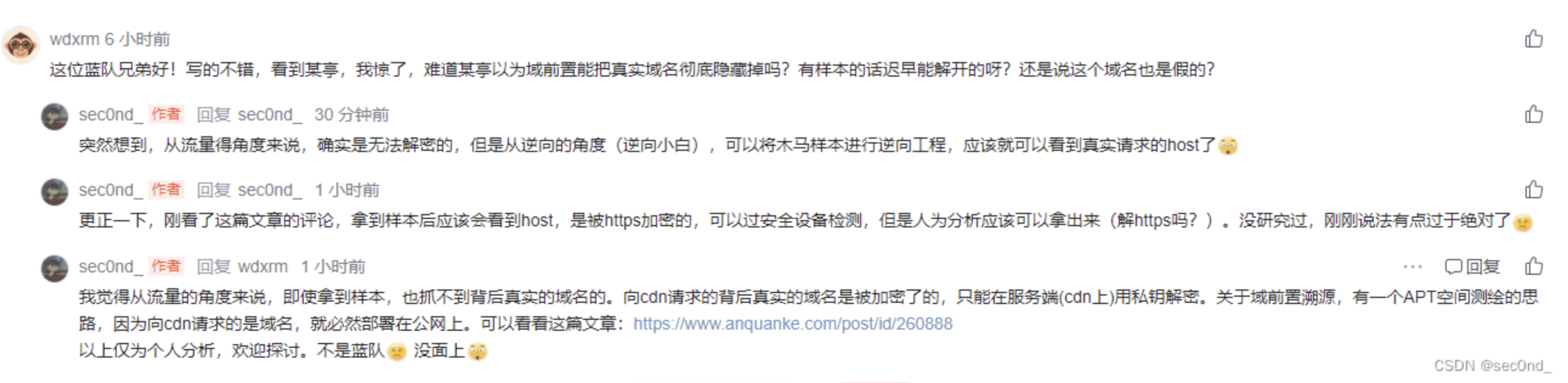 对于这个问题,我没有考虑好,接连回了三条,后来又被我删了。因为也是第一次接触域前置这个东西,打算写一篇关于域前置的文章来解释我的理解,同时下午和晚上也翻看了一些文章,也有了一些新的理解。