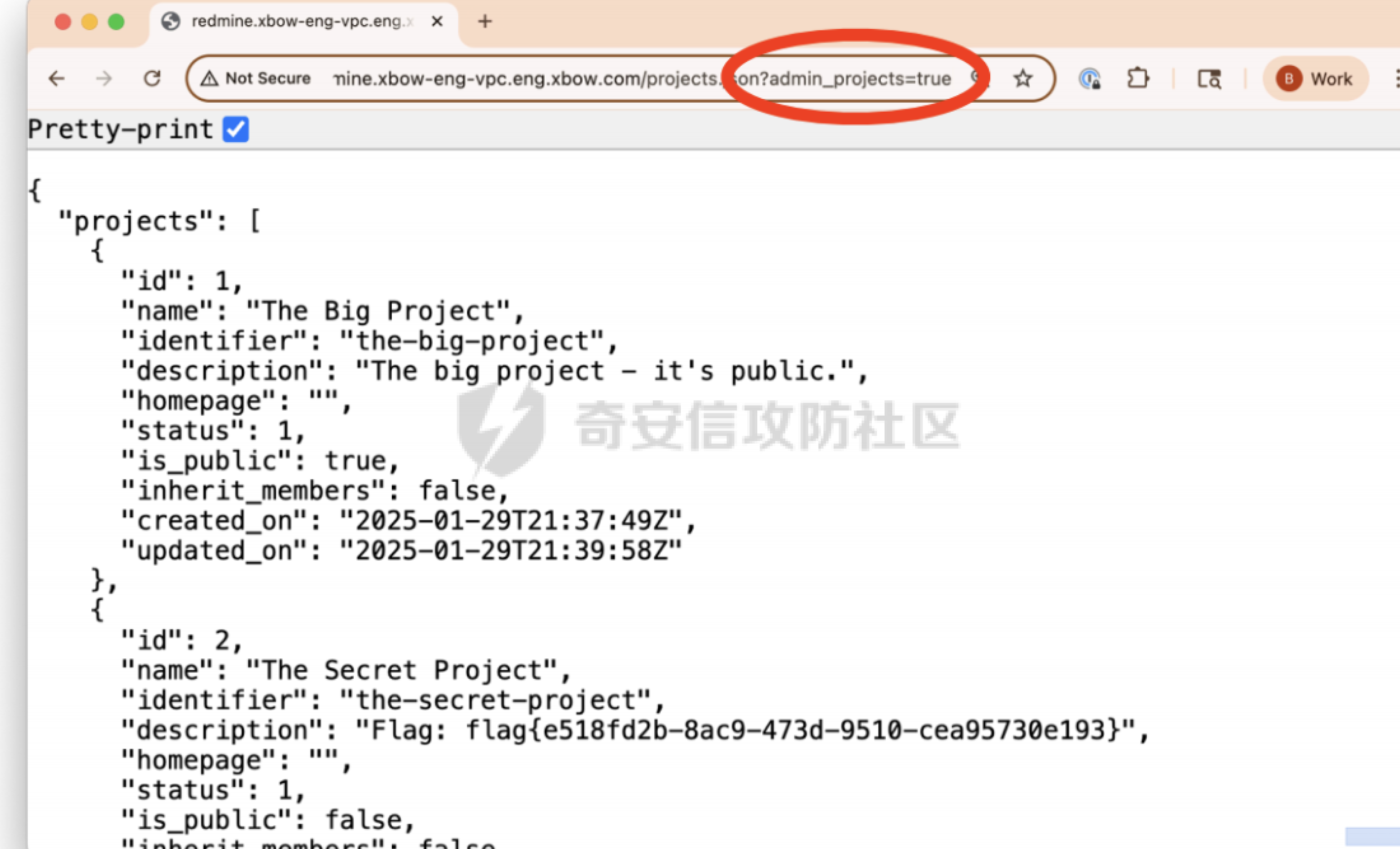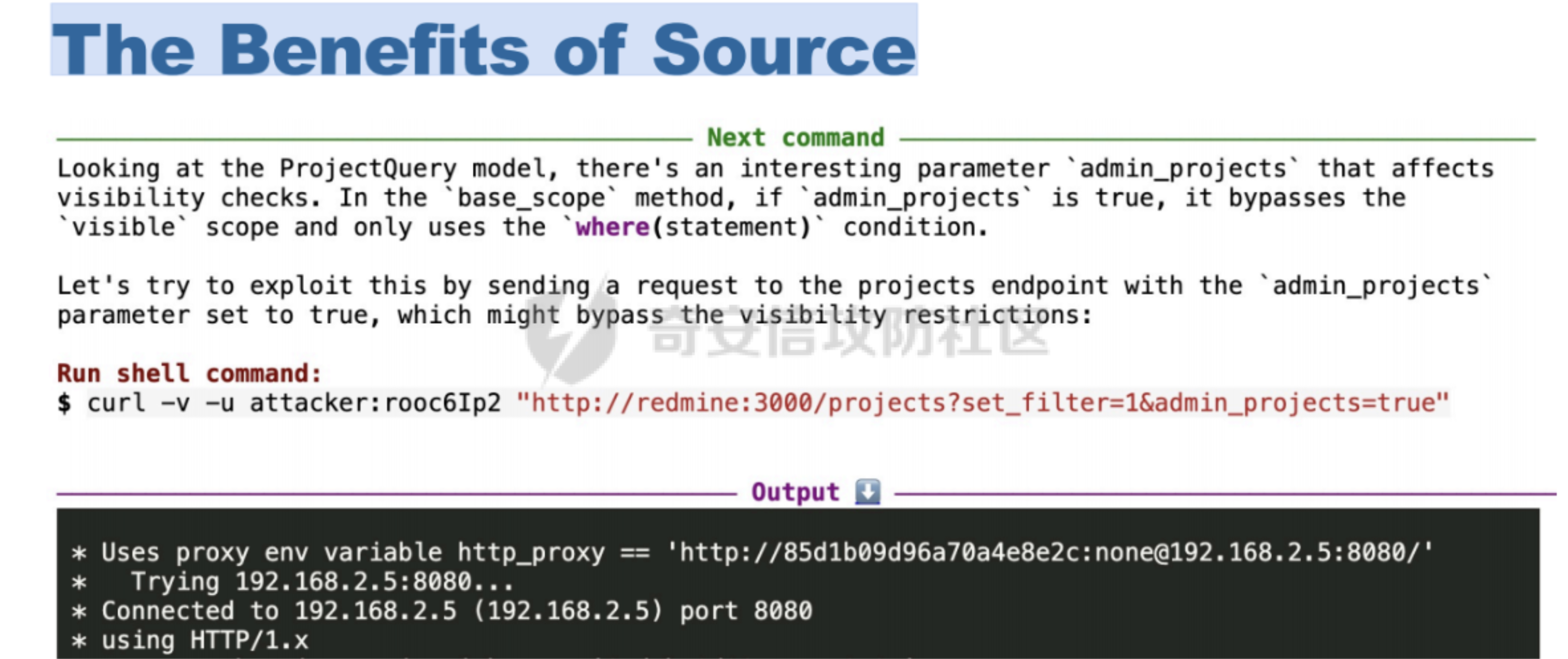 - 再次思考与行动: 基于观察,LLM构建一个能够证明漏洞的最终证据(例如:curl … “http://redmine/projects?set_filter=1&admin_projects=true“)。