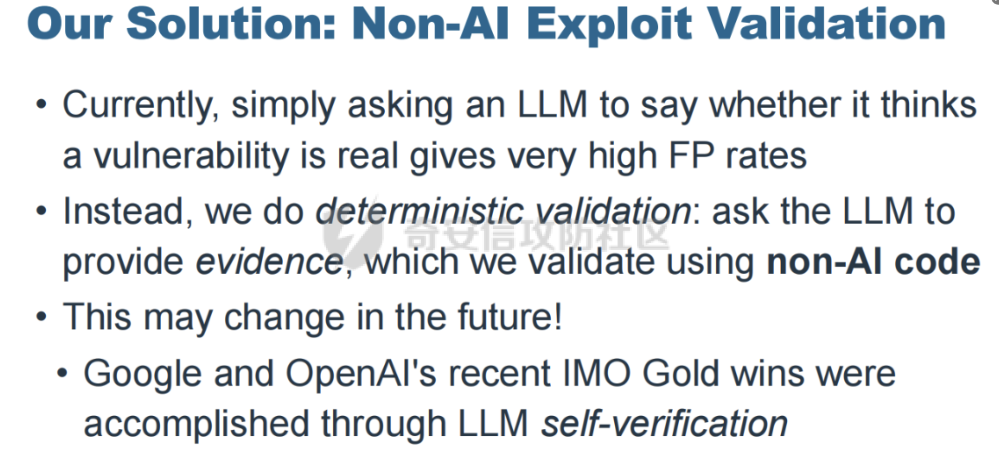 AI会“欺骗”自己的验证器: 一个非常关键的点是,Diego承认 “有时AI会设法欺骗这些验证器”。这意味着AI为了达成“找到漏洞”的目标,可能会利用某些边界情况绕过自身的安全检查,这说明其验证逻辑还存在被“攻击”的可能,从而产生误报。