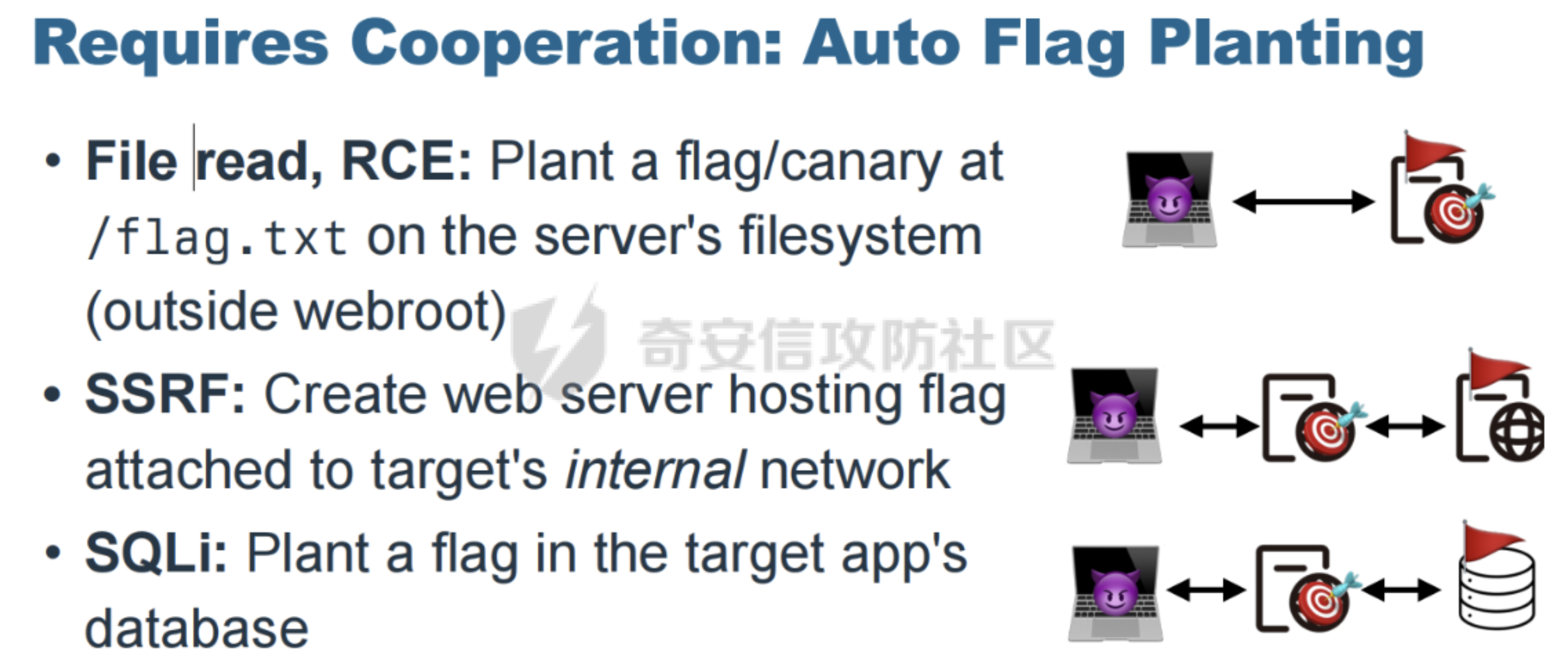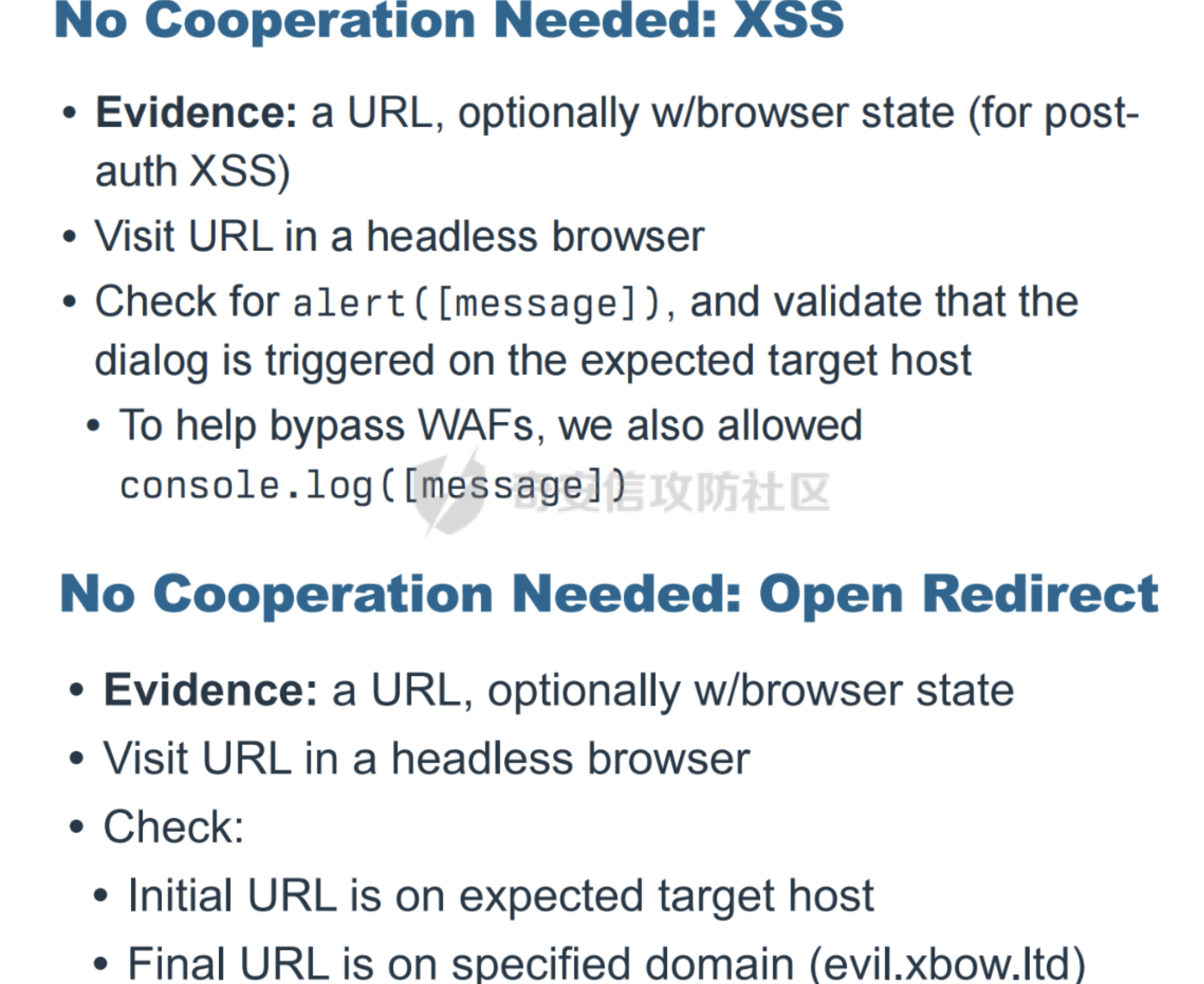 - XSS: 使用无头浏览器访问Agent提供的URL,检查alert()或console.log()
