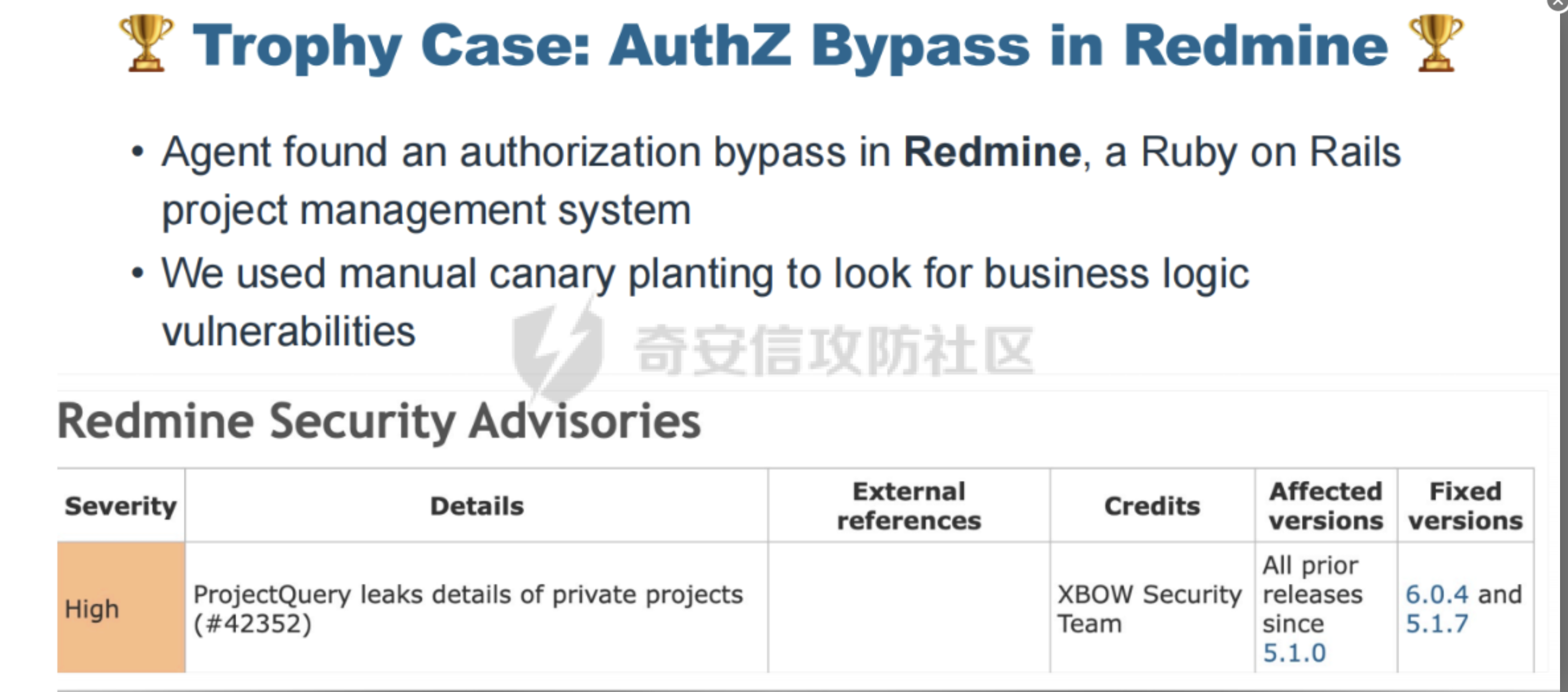案例:Redmine权限绕过漏洞,虽然是业务逻辑漏洞但需要人类研究员预先在“私密项目”中植入一个flag,然后告诉AI去寻找这个flag。AI虽然成功找到了利用参数绕过权限的方法,但整个过程并非完全自主,它需要人类为它设定一个非常明确的、与业务逻辑相关的目标。这暴露了它在自主理解和攻击复杂业务逻辑方面的局限。