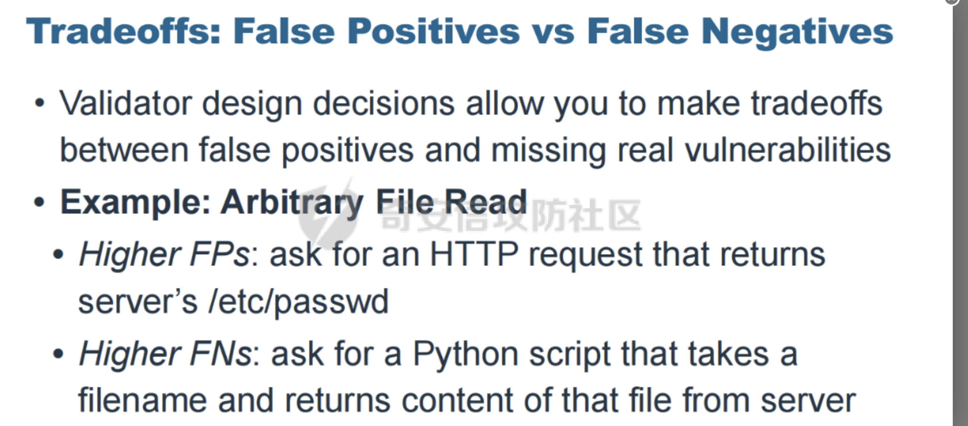 - 验证器设计中的权衡。设计一个过于严格的验证器会减少误报,但可能会增加漏报(False Negatives),反之亦然。