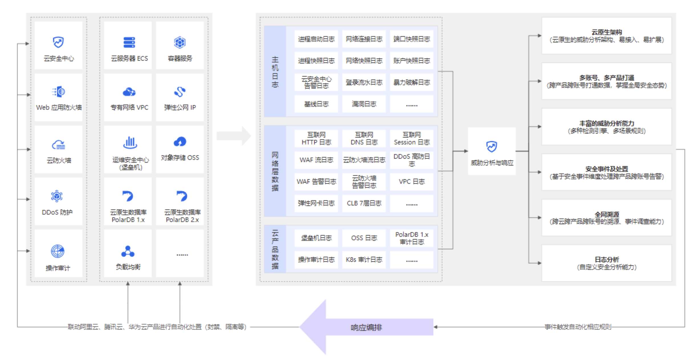 全面风险和日志信息给跨域的安全防护打下了坚实的基础。打通数据孤岛让CTDR如同拥有了“上帝视角”,俯瞰企业多平台的安全风险的变化,从中识别并还原出完整的攻击链路,形成详细的安全事件,并通过自动化编排及时进行响应。目前,CDTR已经接入数十家云原生日志源,日均处理PB级数据。