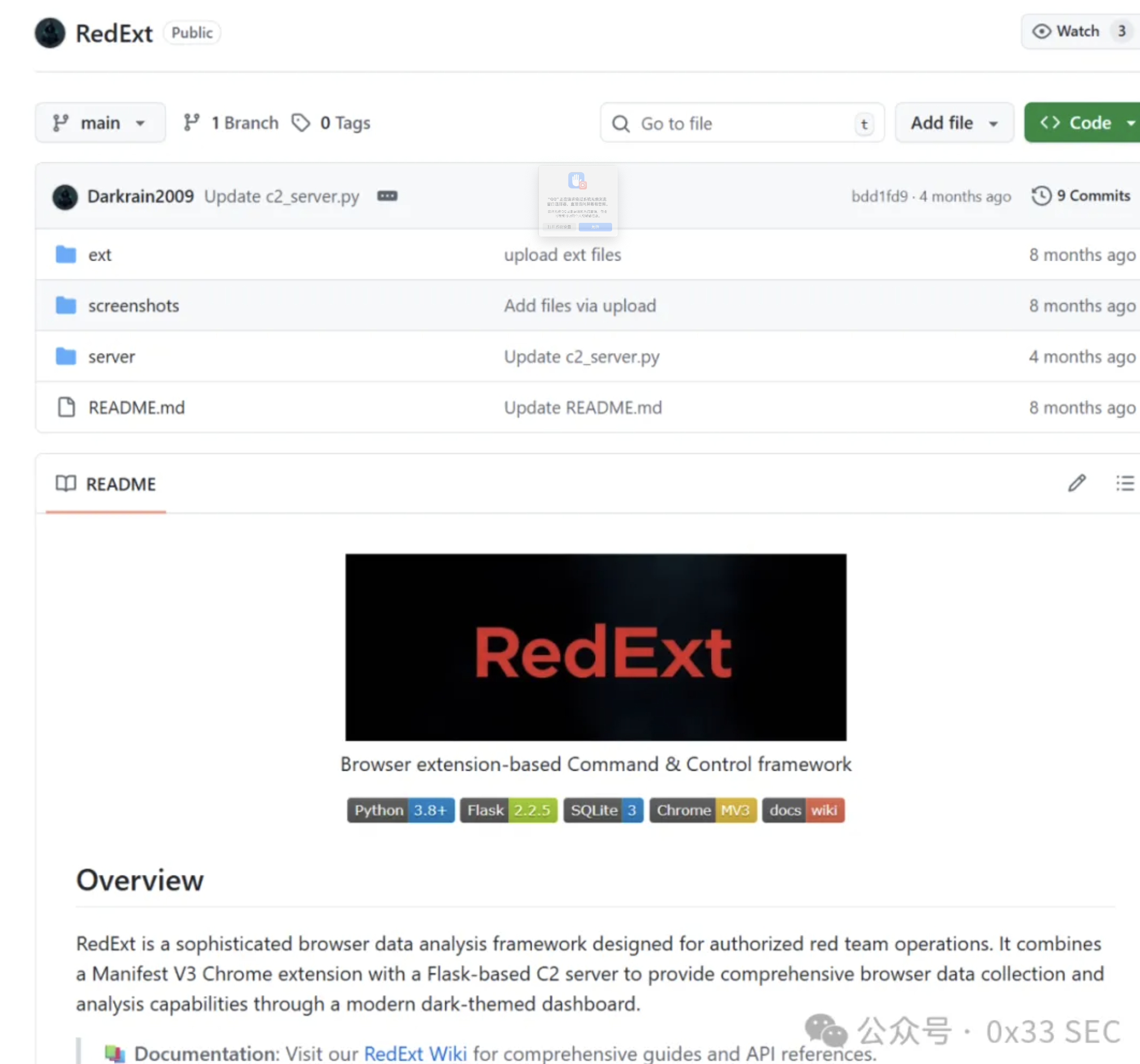 RedExt 是一款完整的浏览器扩展后门与 C2 框架——在被安装后它会向远程服务器注册为受控代理(agent),并通过轮询的方式接收并执行下发指令。RedExt 能执行一系列高风险操作:截取活动标签页截图、收集并外发 Cookie、localStorage、sessionStorage、表单内容、剪贴板、浏览历史与书签,以及下发 DOM 快照或远程脚本注入等。项目作者(@darkrain2009)将其以开源形式发布、以浏览器插件作为主要传播与控制载体的完整 C2 实现;这一公开化既便于研究与检测,也显著提升了滥用风险。