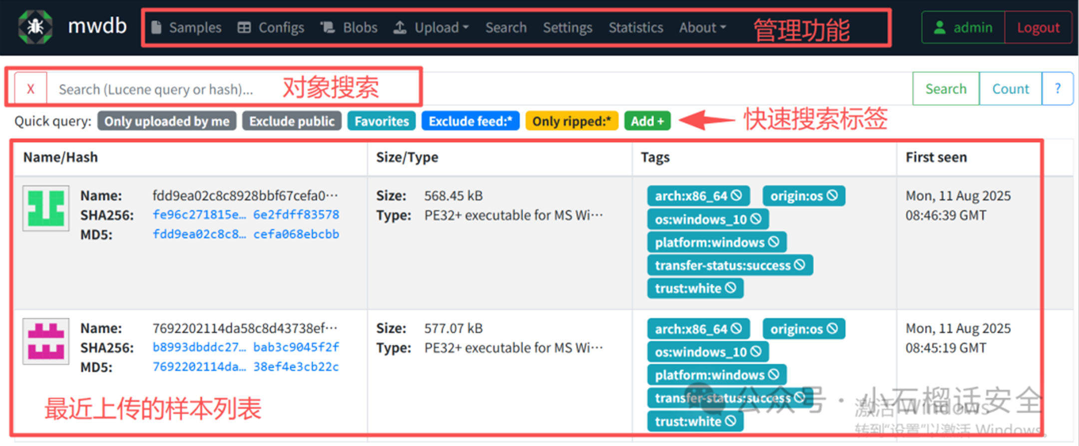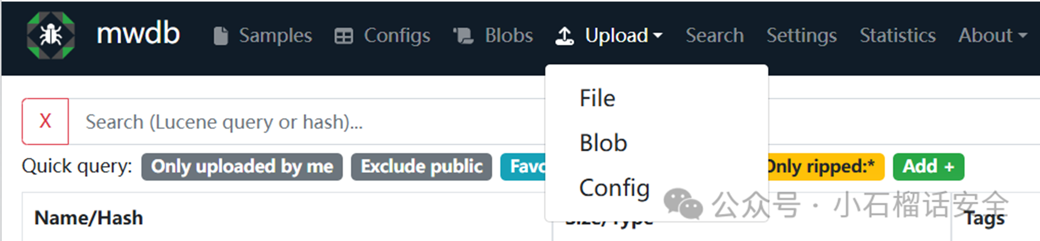 从上面的主页面中,可以看到MWDB中最重要的三类对象: