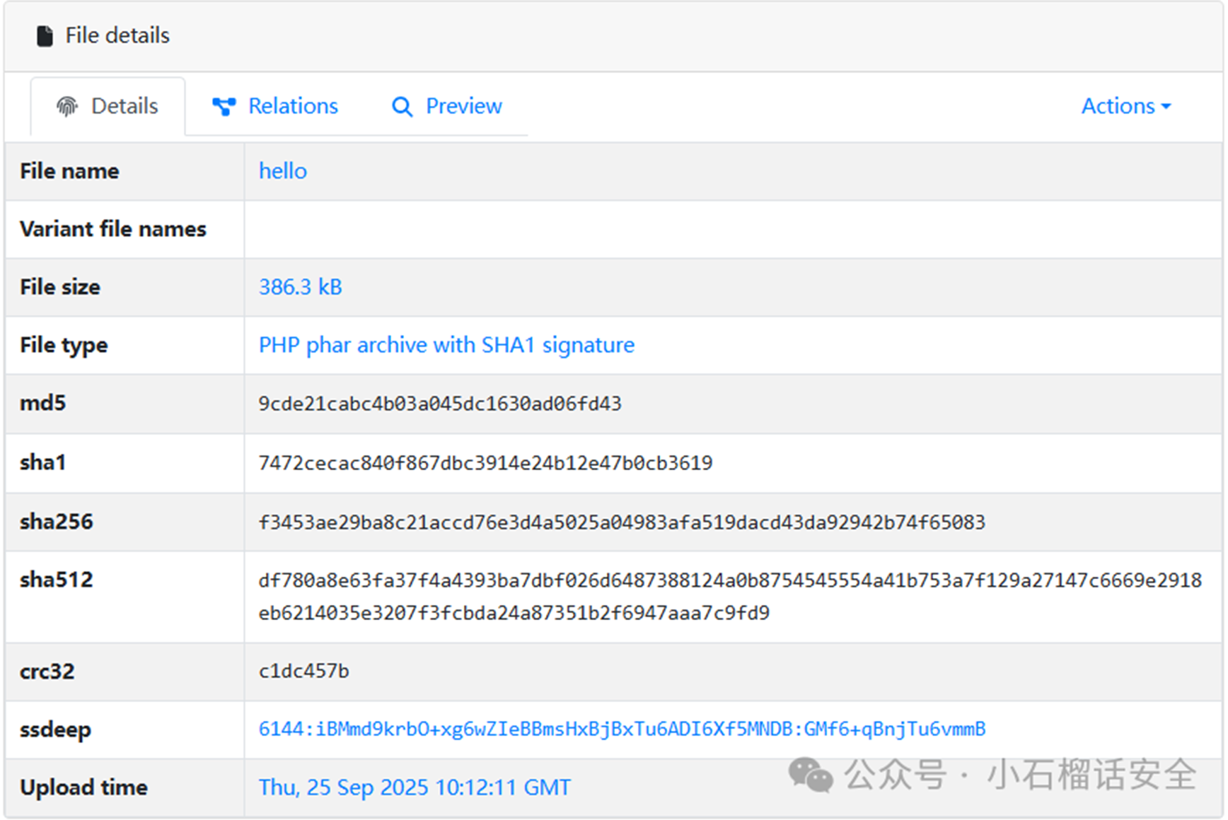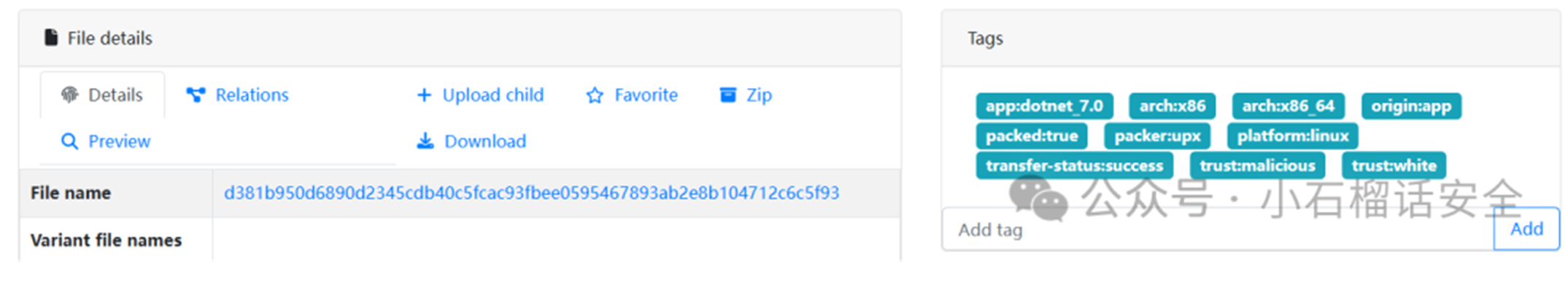 文件是 MWDB 中的主要对象类型,用于存储各类形式的恶意软件样本和工件,例如二进制文件、内存转储文件、脚本文件、归档文件等等。当然,在实践中还是主要用于存储二进制样本文件。