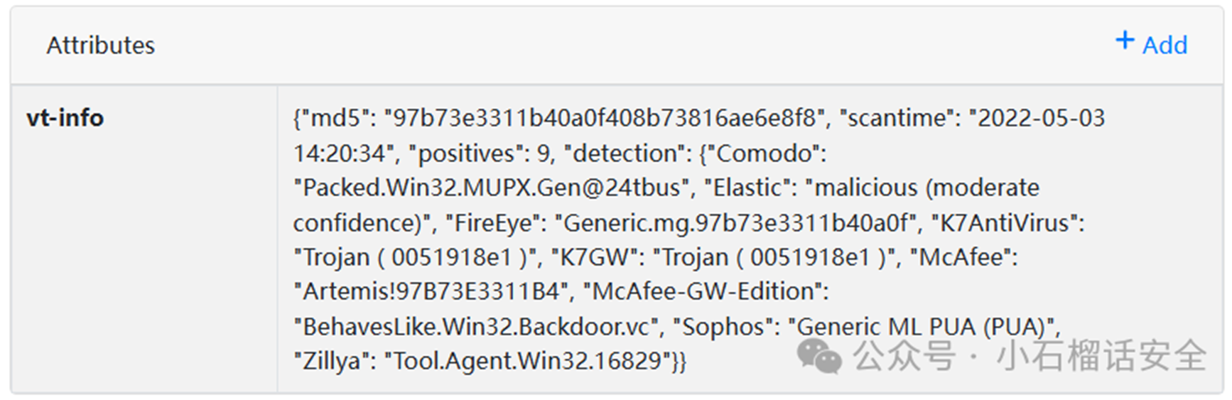 属性是由唯一的键值对组成的集合,可以用于存储外部系统的分析结果或其它任意信息,比如virustotal的分析结果。