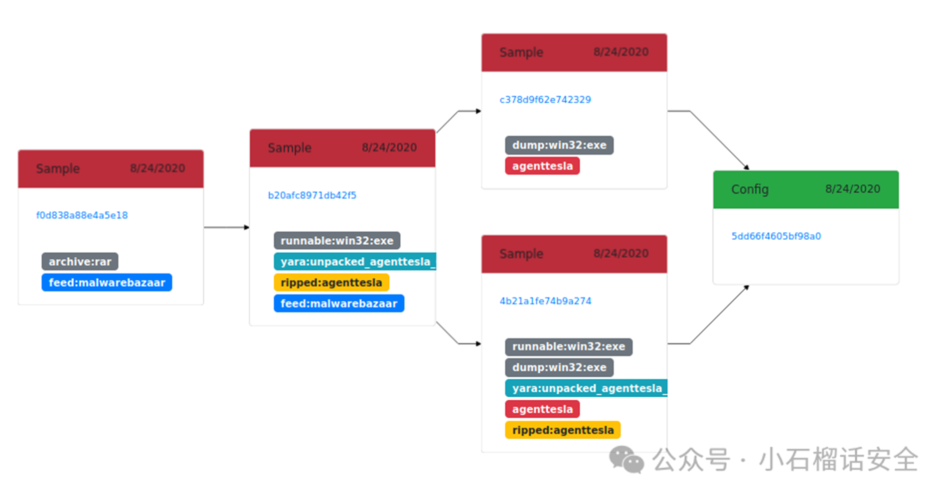 MWDB 中的对象之间可以通过父子关系形成有向无环图。这些关系表示恶意软件样本、提取的配置和相关构件之间的逻辑联系。