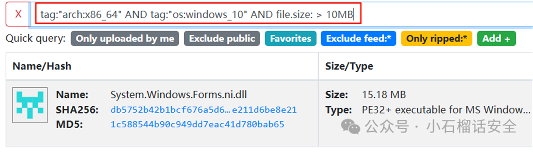 比如下面的查询为包含标签”arch:x86_64″和”os:windows_10″,以及文件大小大于10MB的所有样本。