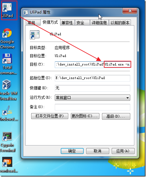 6.所以,看来还要去把对应的桌面上的快捷方式也加上对应的-n参数: