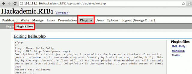 ps:(1)Hackademic RTB1系统的下载地址是:http://download.vulnhub.com/hackademic/Hackademic.RTB1.zip ,Hackademic.RTB2的下载地址http://download.vulnhub.com/hackademic/Hackademic.RTB2.zip(2)在使用管理员账号进入wordpress后台后,并没有发现文件上传的位置。是通过plugin-editor修改文件来获取webshell。