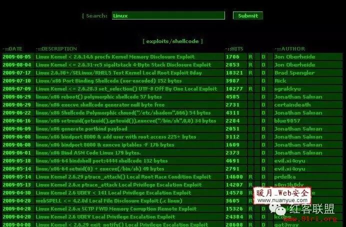 在寻找本地提权利用程序时,通常是根据系统版本来进行,应用程序的本地提权也是一样的。在网上就有可供查询的网站,比如http://www.milw0rm.com/网站如图: