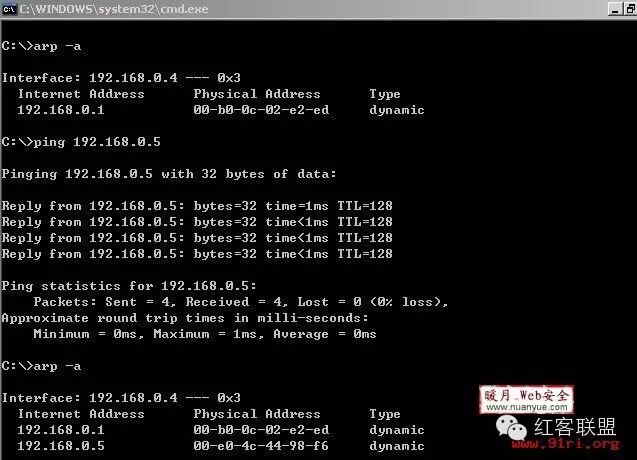 我们来与IP192.168.0.5进行通信,通信后arp缓存表就会有这样一条MAC地址和IP对应的记录。如图: