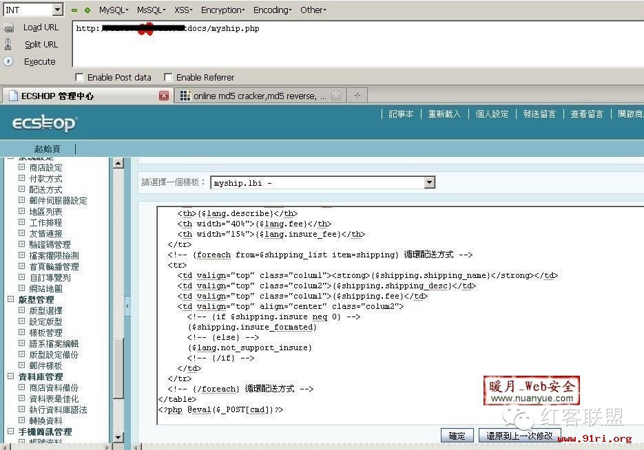 获取管理员帐号和密码,ECShop使用的是MD5加密,直接解密。原来密码是admin,有点意料之外。访问管理后台,修改模版处,插入一句木马,即可得到WEBSEHLL,如图: