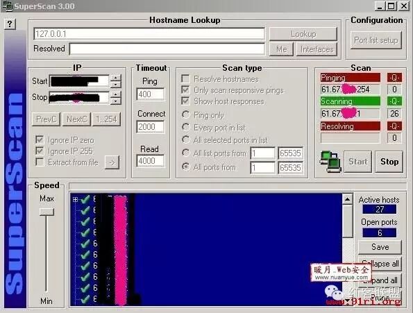 在寻找突破时,更多的是从应用服务来, 而应用服务最直观的信息采集,就是端口扫描,不同的应用,开放的服务不一样。所以,在对网络进行信息收集时, 大概分为这样两步: 端口探测,程序指纹分析。在端口探测方面,个人喜欢用SuperScan来快速对网段里的应用进行判断,如图: