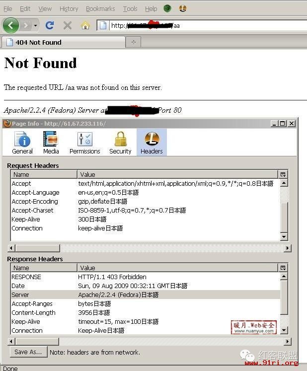 在掌握端口信息后,就要对服务应用程序的指纹进行分析,主要包括版本号、已知的漏洞信息、常规配置信息、针对此应用流行的攻击方法等。本文试着对网内一台提供WEB服务的主机作为突破口,提交一个畸形的请求,如图: