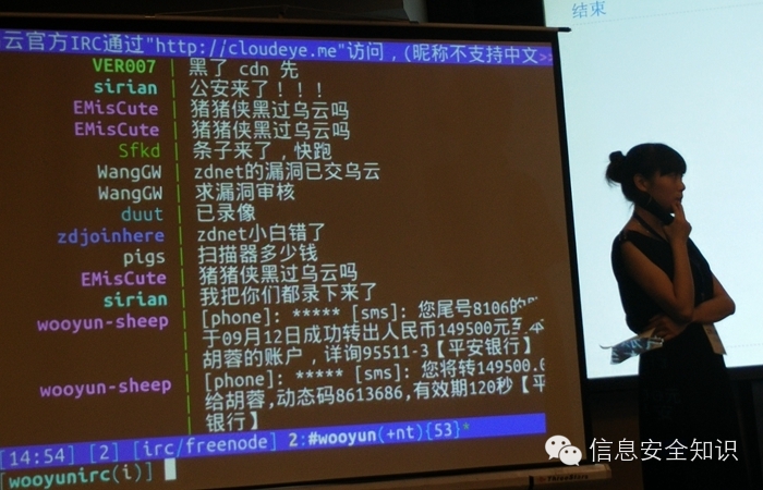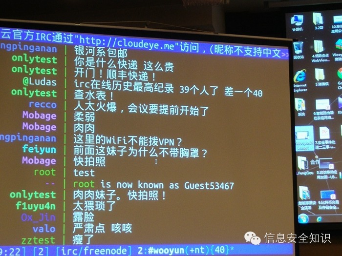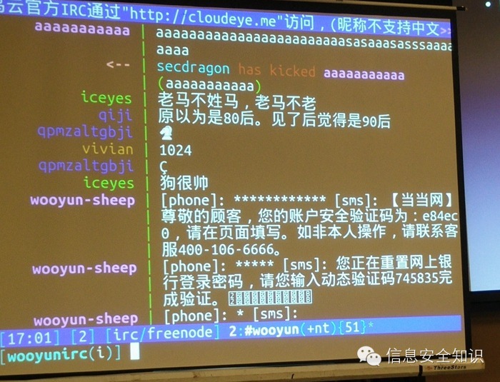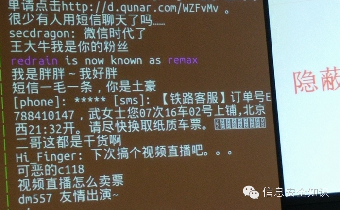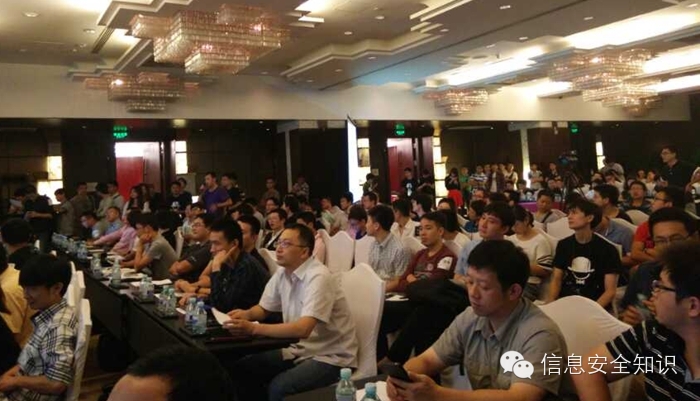 虽然孟卓的演讲题目为《2014年 十大最新安全风险解析》,但他实际主要讲的是乌云平台的建立和发展历程,以及如何为企业为社会做好安全服务,如何改善和提高白帽子的研究环境。最后他强调 了一下本次会议与其他会议的不同之处,那就是“场里捞”――通过硬软件设备监听皇冠假日酒店及附近范围的手机通讯,并把监听到的内容发送到会议现场显示乌 云官方IRC大屏幕上。