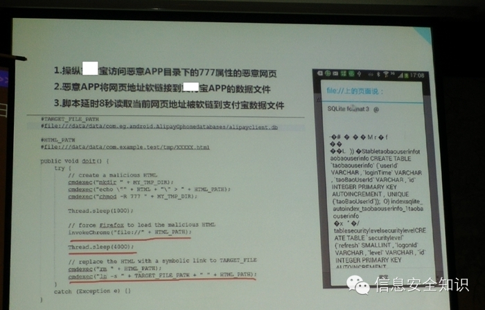 Google等于是在APP里,内置了远程代码执行漏洞,但Google只修复了chrome APP,一直到4.4.4才彻底修复其他APP中的漏洞。茄子当场演示了粗粮的远程执行漏洞,用内置浏览器打开网页,拿到手机的root权限。另外还演示 了拿到微信APP的权限,远程控制手机打电话。当然,微信能做的事,都可以远程控制去做,大家自行脑补吧。