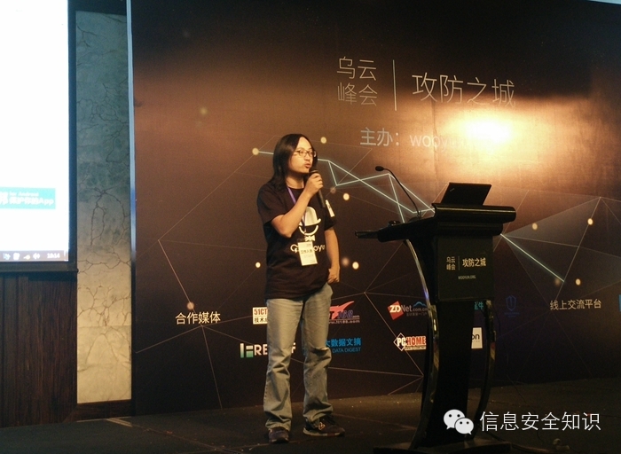 在二哥激起了一个小高潮之后,登场的是RAYH4c,乌云ID茄子。茄子是360的资深安全攻城狮,主攻移动安全,他今天带来的议题是《安卓组件 WebView的那些神洞》。对安卓系统有所了解的人知道,安卓系统上的新浪微博、QQ都使用webview组件,但由于“google的非常不负责 任”, 4.4版本的都存在UXSS漏洞。(茄子在场下告诉安全牛君,他绝对不会用安卓手机,太不安全啦!)